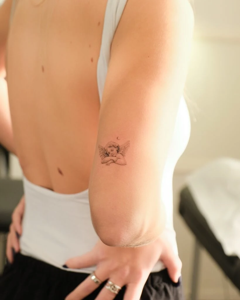 Positioned just above the elbow, the design includes subtle wings and a tiny crescent moon above the angel’s head. It’s a symbol of innocence, divine protection, and serenity—often associated with remembrance or a sense of spiritual calm. The soft linework and placement make it a beautiful, feminine tribute that balances meaning with graceful artistry.