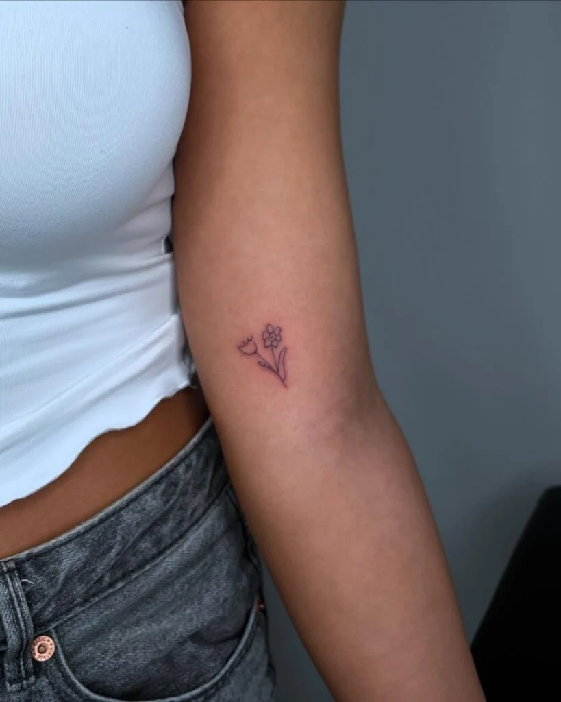 This sweet and simple tattoo features two small flowers—one with petals and one as a closed bud—inked in fine lines on the upper arm.