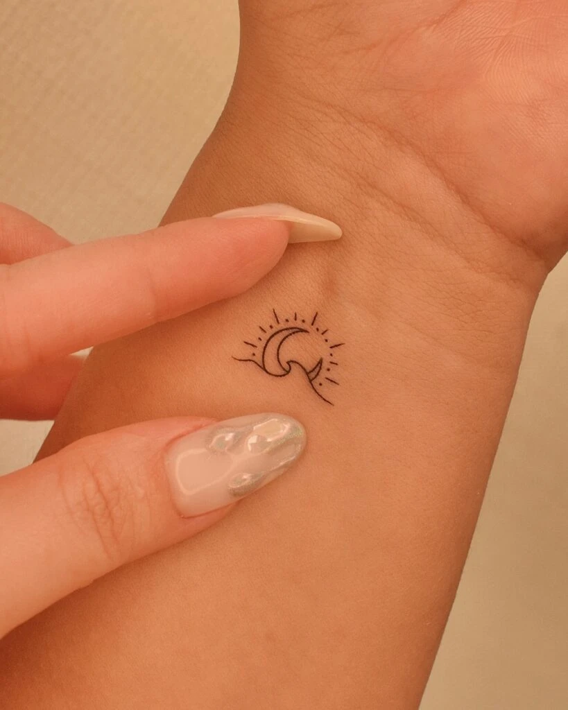 This minimalist tattoo features a small ocean wave curling beneath a rising sun, placed delicately on the wrist. The fine linework gives it a clean, elegant look while symbolizing harmony between strength and serenity.