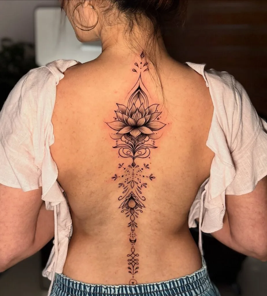 This beautifully detailed spine tattoo features a large, shaded lotus flower at the top, symbolizing enlightenment and purity. Flowing downward are ornamental motifs and precise dotwork patterns that gracefully follow the spine’s curve.