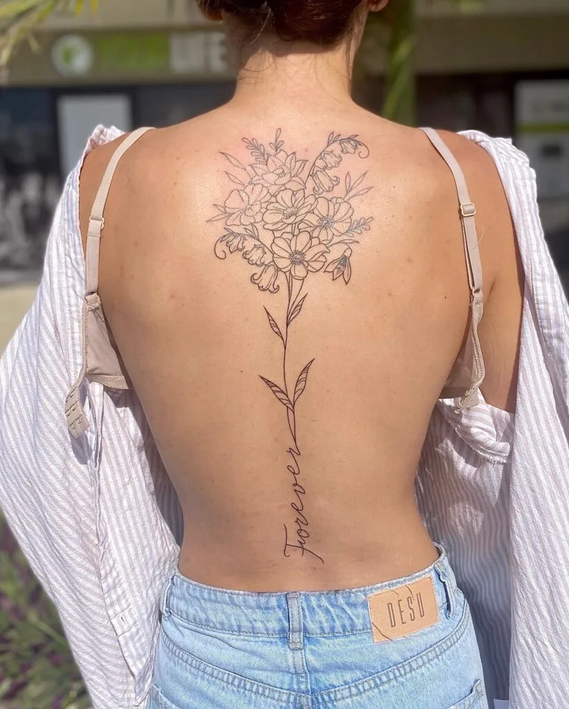 This elegant spine tattoo showcases a beautifully detailed bouquet of wildflowers blooming across the upper back. The bouquet extends downward as a single stem, seamlessly incorporating the word “Forever” written in graceful script. The fine linework and botanical elements create a soft, romantic feel, while the vertical placement enhances the spine’s natural symmetry.