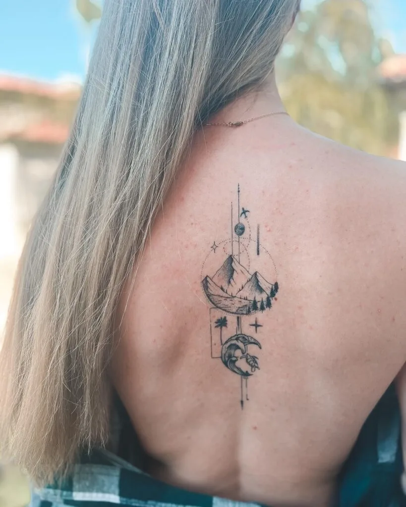 This stunning mid-back tattoo blends nature and celestial elements in a dreamy vertical composition. At its center, a shaded mountain scene is framed by delicate linework and surrounded by stars, planets, and fine geometric shapes.