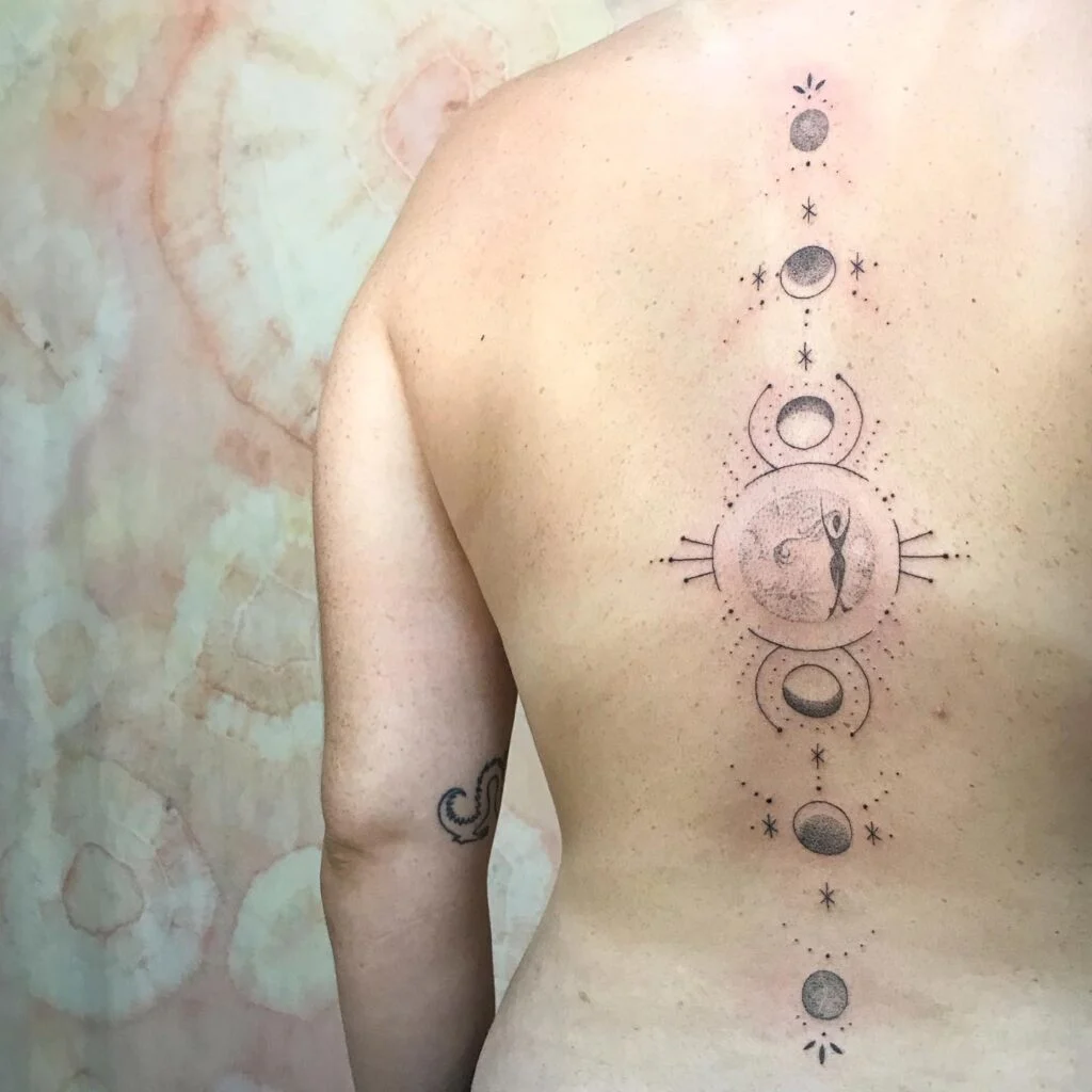 This celestial spine tattoo beautifully illustrates the phases of the moon, centered around a radiant full moon containing the silhouette of a dancing feminine figure. Each moon phase is arranged symmetrically along the spine, surrounded by stars and soft dotwork that enhance the cosmic feel.