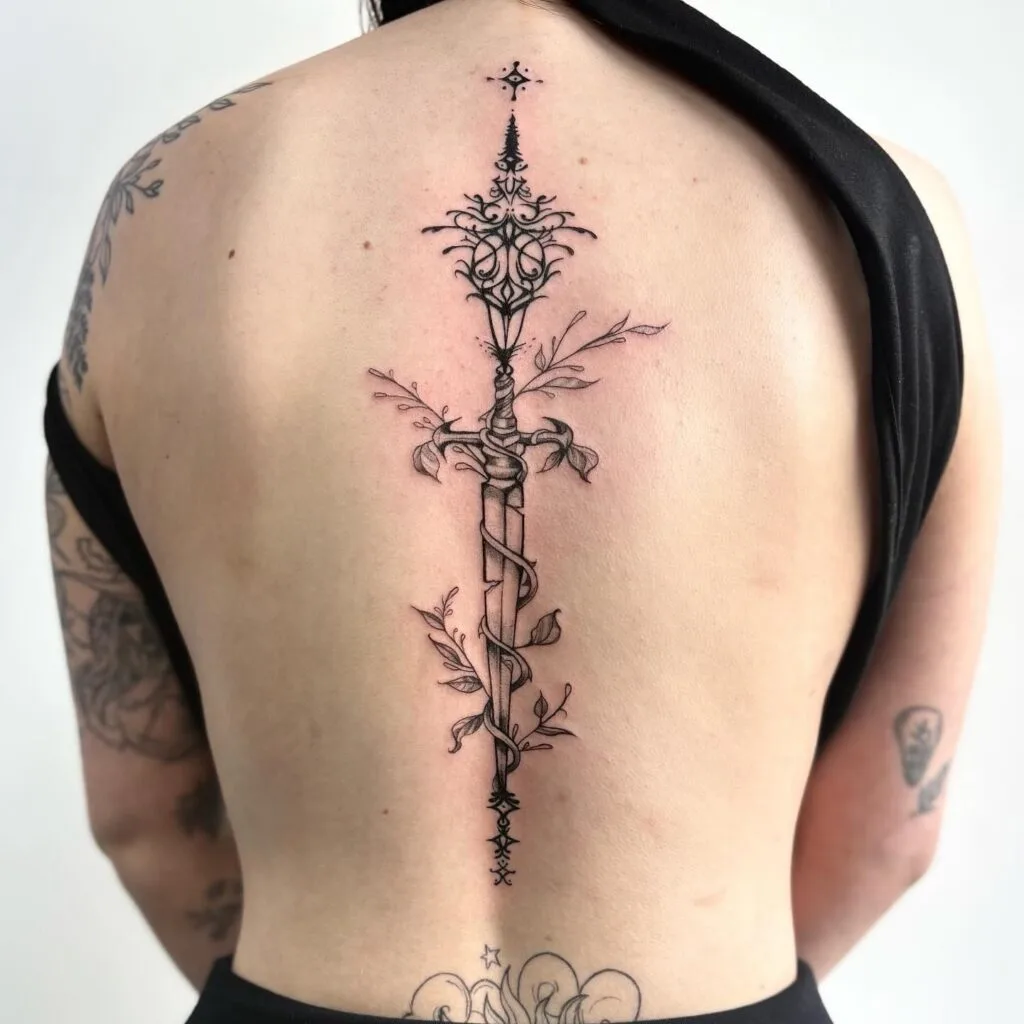 This dramatic spine tattoo features an intricately detailed sword stretching down the back, entwined with delicate vines and leafy branches. The ornate hilt is adorned with filigree-style designs, adding a regal and mystical feel. The fine linework and shading give the piece an elegant balance between strength and grace.