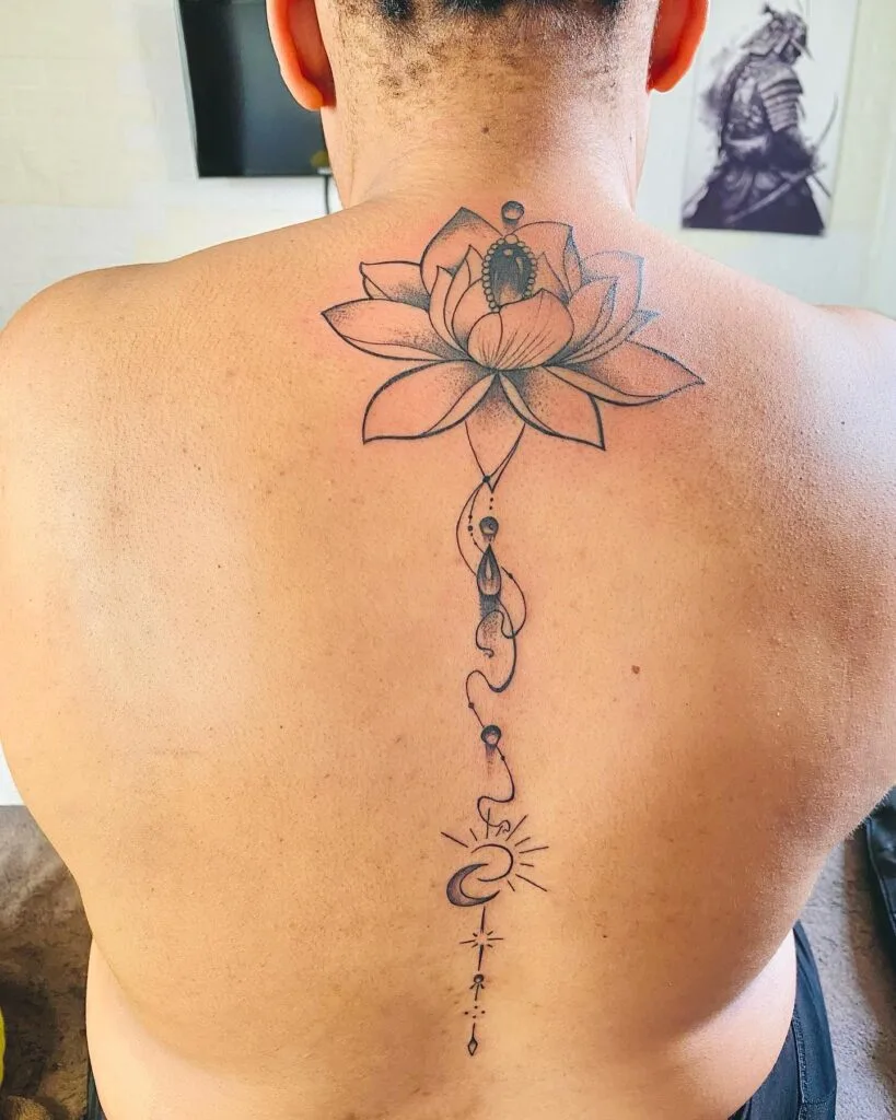 This stunning spine tattoo begins with a large lotus flower at the top, delicately shaded and crowned with a sacred jewel-like detail. Below the lotus, a flowing line winds down the spine, featuring abstract curves, droplets, and planetary symbols that lead to a crescent moon and radiant sun.
