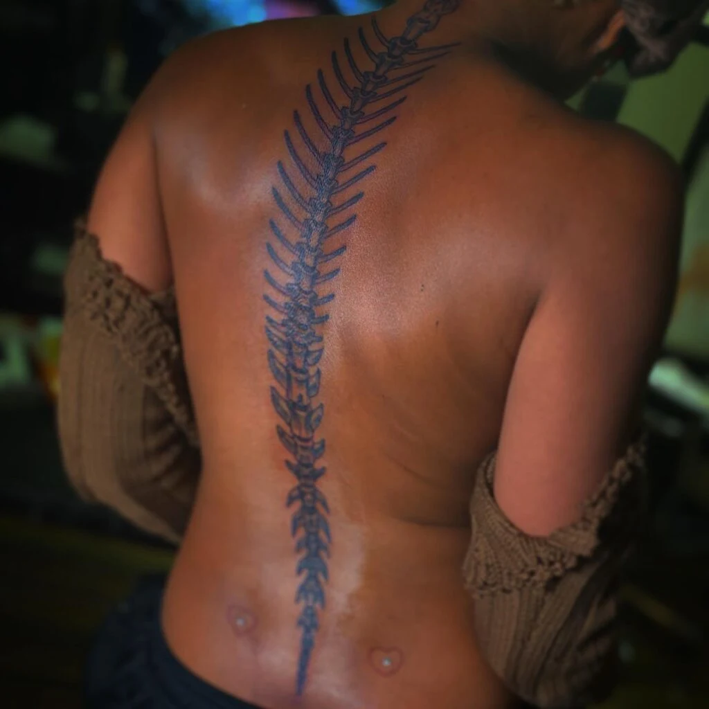 Its dark shading and precise detailing give it a slightly edgy, anatomical appeal. Perfect for someone drawn to body structure, strength, or transformation, this tattoo makes a confident and deeply personal statement about resilience and the backbone of identity.