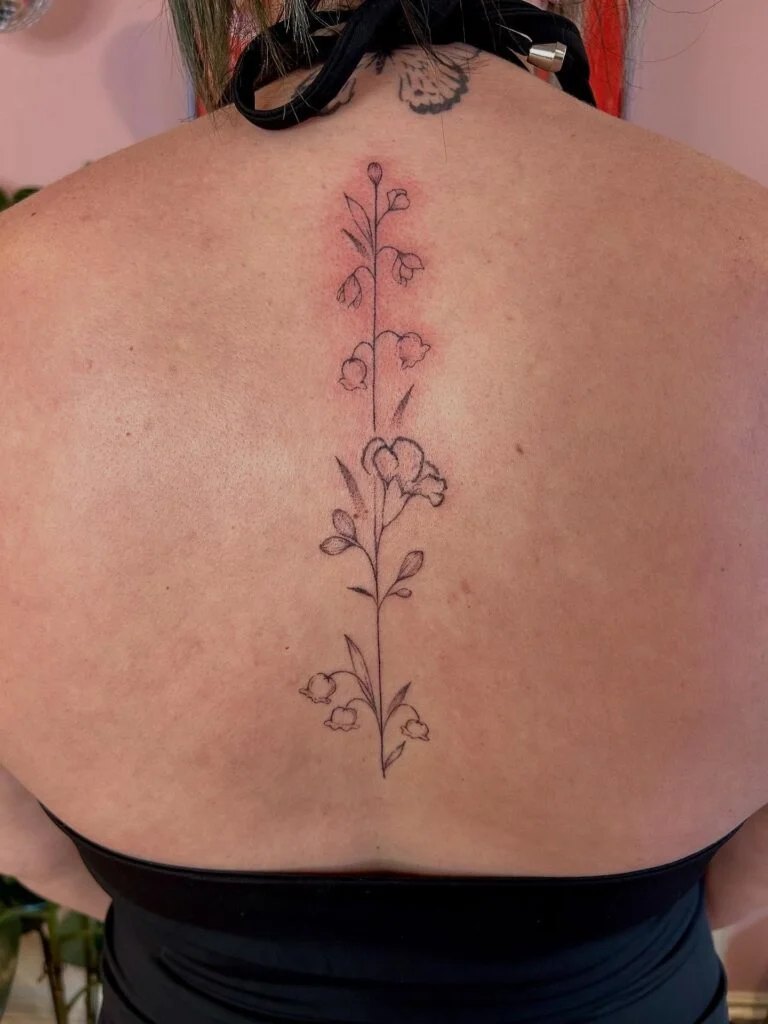 This delicate spine tattoo features a vertical sprig of lily of the valley flowers, each tiny bloom gracefully hanging from a slender stem. The fine-line work and minimal shading highlight the elegance and natural rhythm of the plant.