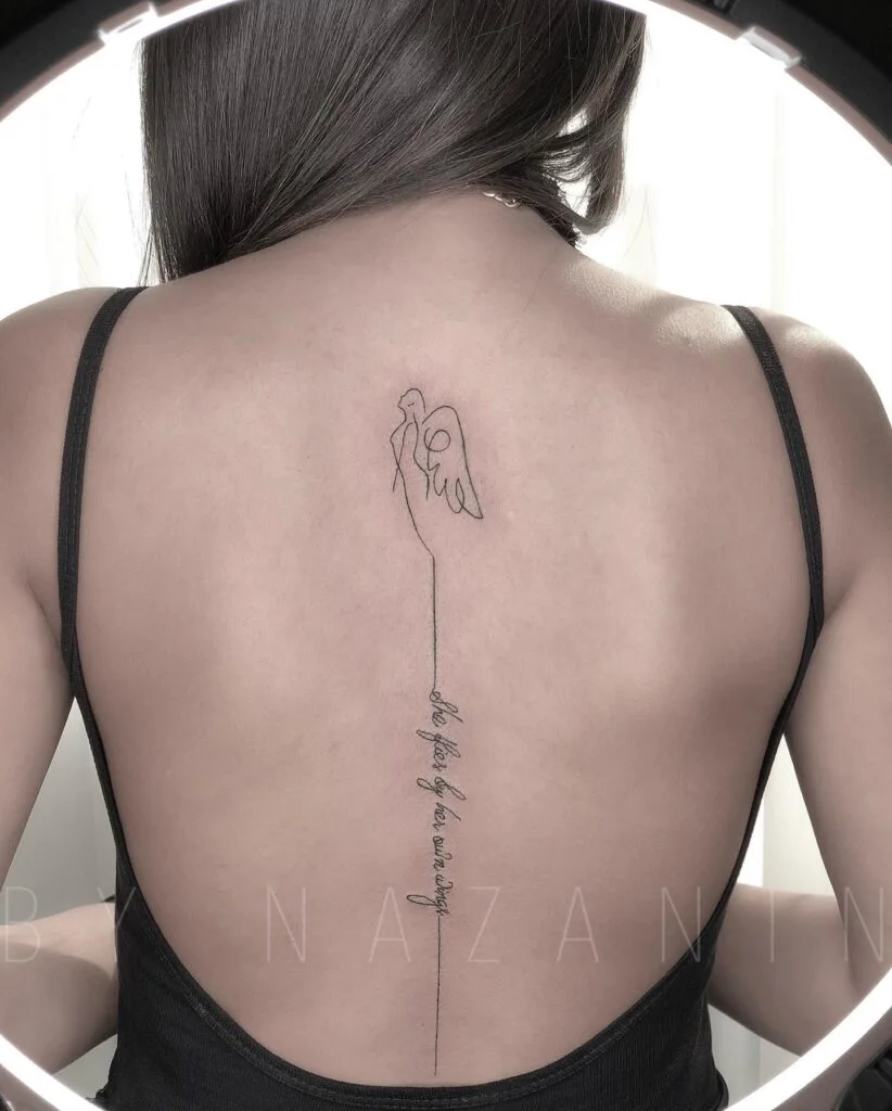This delicate spine tattoo features a fine-line outline of an angel at the top, with flowing hair and a single wing. A thin vertical line connects it to a graceful handwritten quote that reads, “She flies by her own wings.”