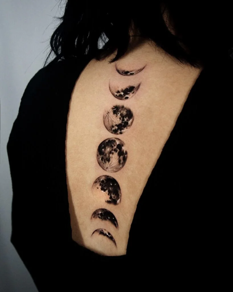 This captivating spine tattoo features a vertical sequence of moon phases, rendered with realistic shading and lunar texture. From crescent to full moon and back, each phase is meticulously detailed, showing crater-like marks and soft transitions in light and shadow.