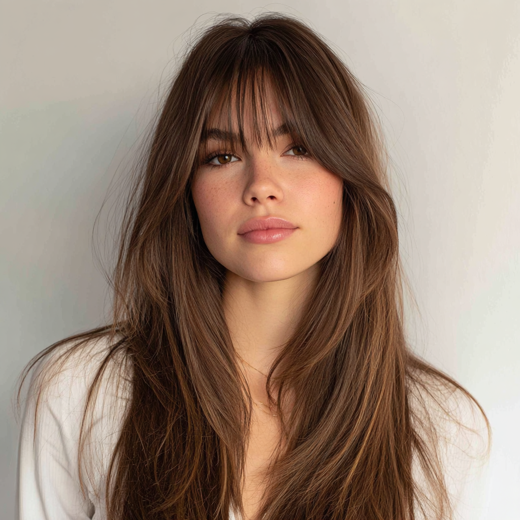 This long straight style pairs soft ends with a wispy fringe that falls lightly across your forehead. The fringe stays airy, giving your face a gentle frame without feeling heavy. The rest of the hair remains simple and smooth, which keeps the focus on the fringe.