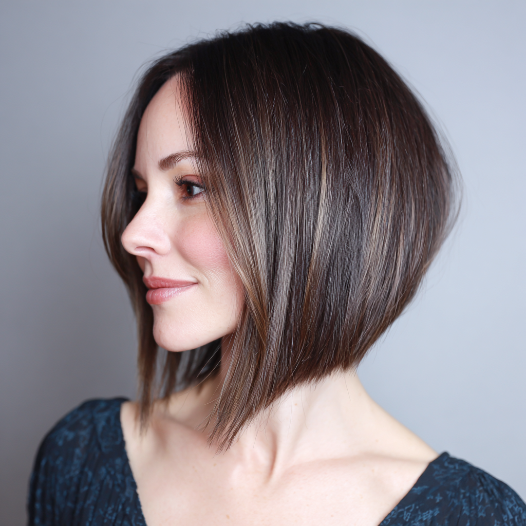 This angled bob uses a slight forward tilt to create shape while keeping the hair completely straight. The back sits shorter, giving the cut lift without relying on layers. The front pieces elongate your face gently. You can keep it sharply straight or soften the edges with light smoothing.