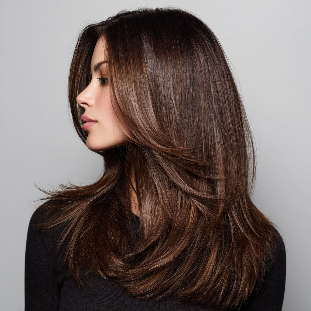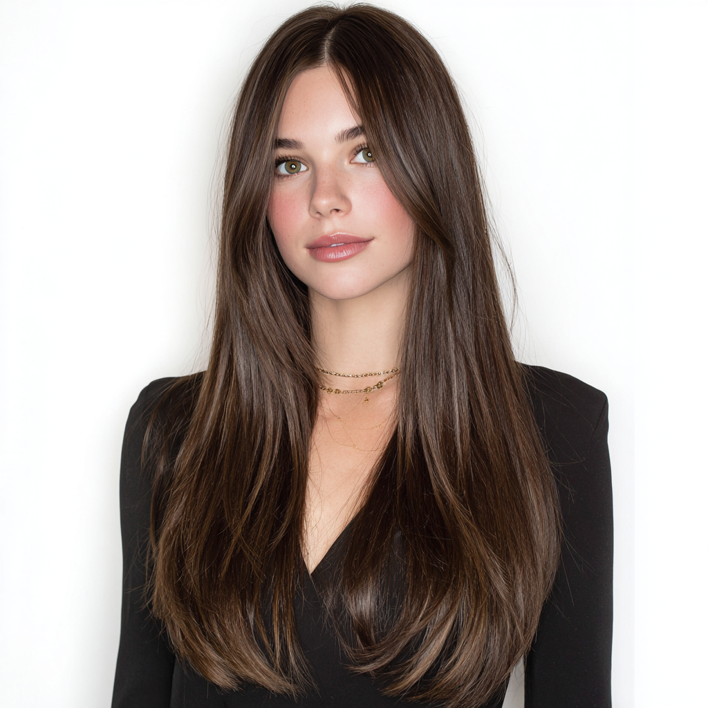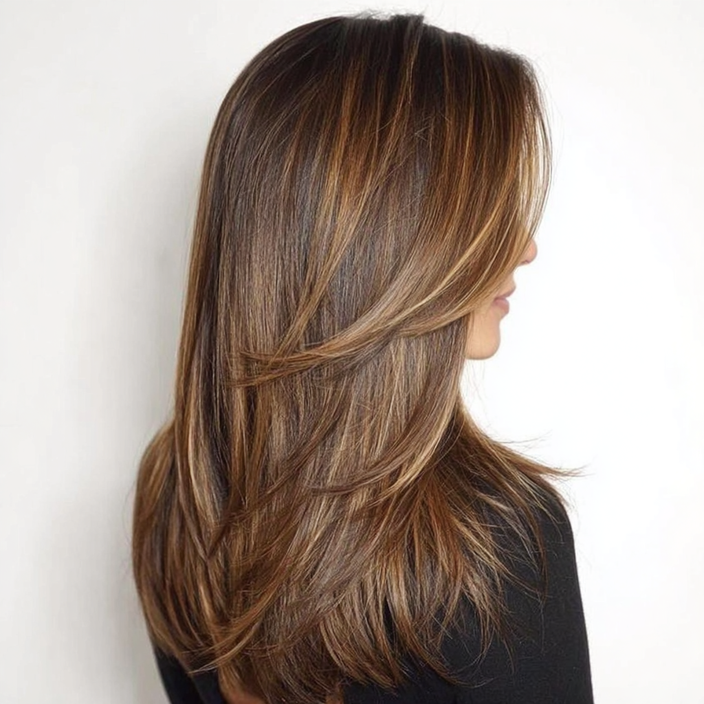 This long layered style keeps straight hair flowing while removing weight from the ends. The layers are light and gradual, creating natural movement without breaking the smooth shape. It works well for women who want length but prefer a softer finish.