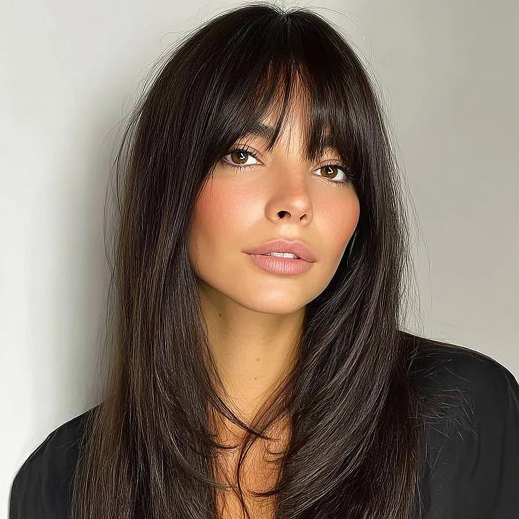 This straight style uses long side-swept bangs to soften your look and create a smooth transition across your forehead. The bangs blend into the sides, so you avoid harsh lines. The rest of the hair stays simple and straight, making it easy to style.