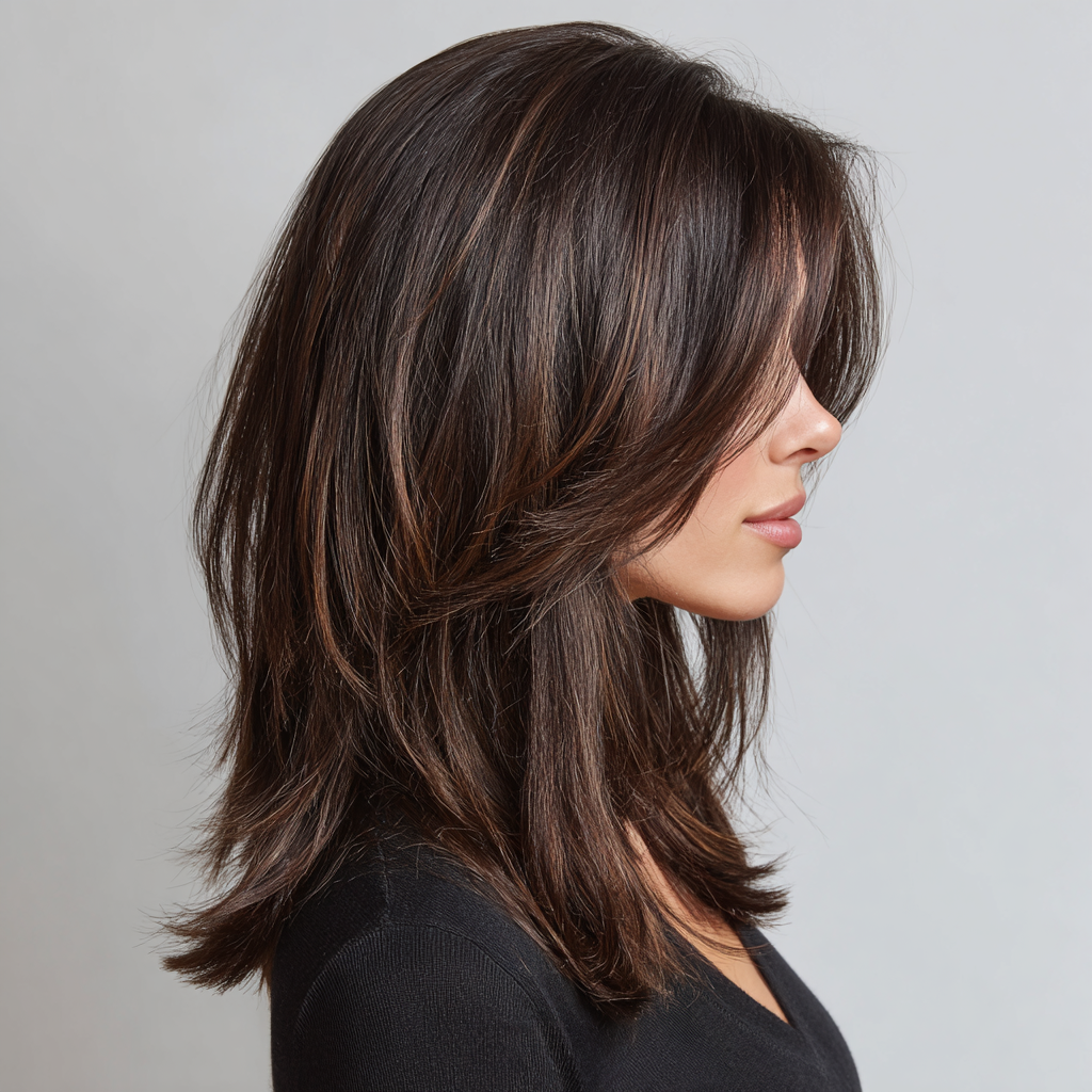 This mid-length cut adds subtle feathering around the ends, creating a soft finish without losing fullness. The feathering lifts the outer shape, helping the hair move more easily. You can wear it casual or polished, depending on your routine.