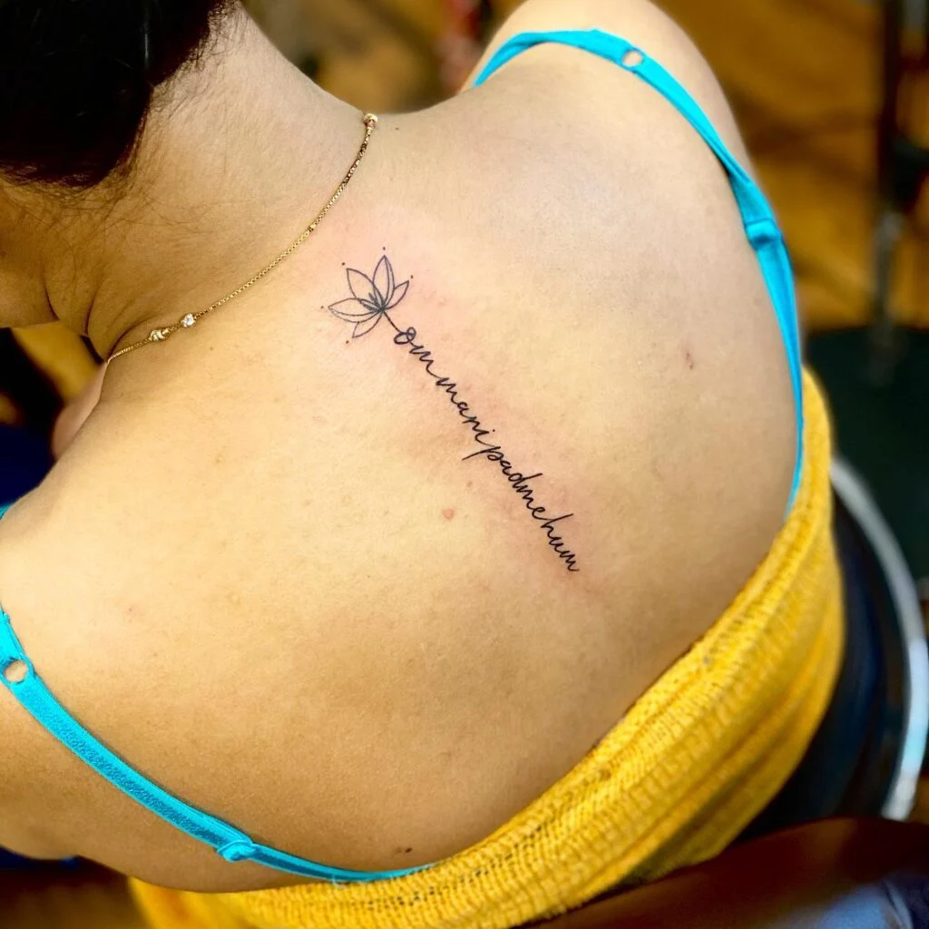 This serene back tattoo features the sacred mantra “Om Mani Padme Hum” in graceful cursive, accompanied by a delicate lotus outline. Placed diagonally across the upper back, the design symbolizes purity, spiritual awakening, and inner peace. The lotus flower represents rising above challenges, while the mantra is believed to invoke compassion and wisdom.