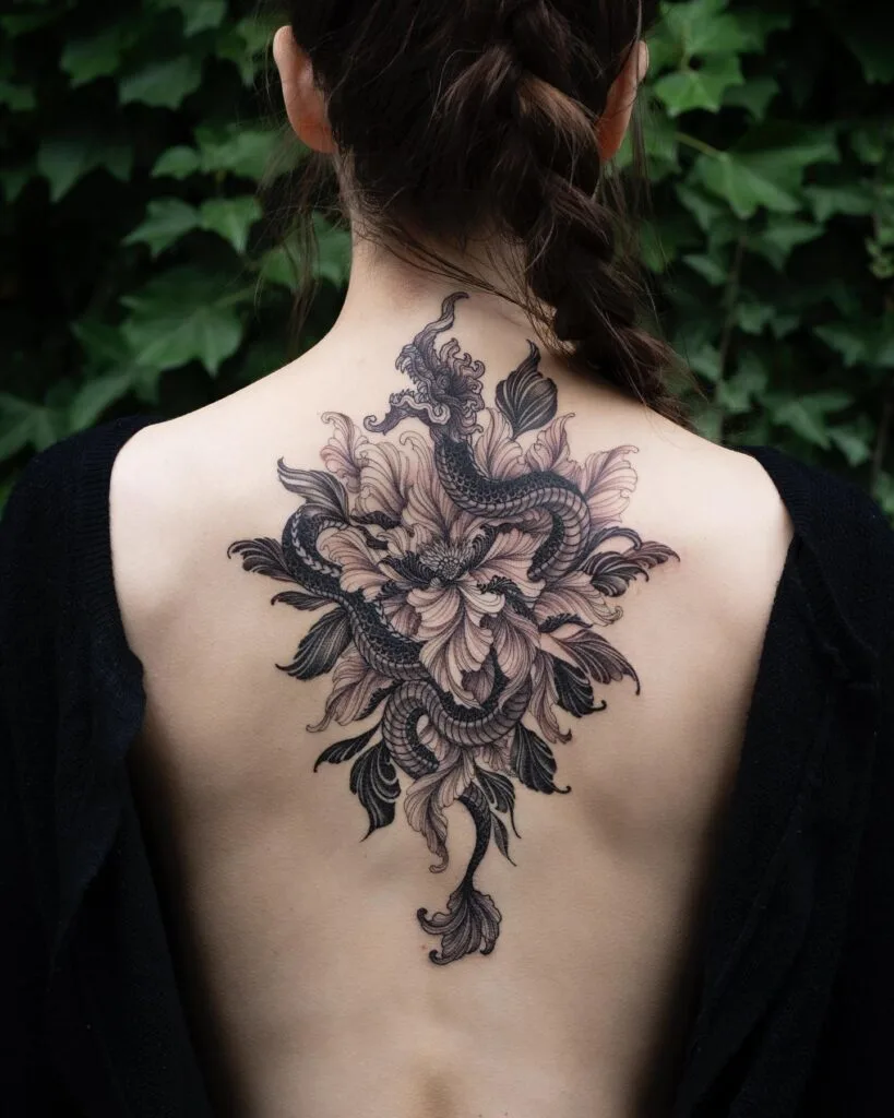 This elegant back tattoo features a coiled dragon weaving through large, blooming petals. The intricate scales contrast beautifully with the flowing floral lines, blending power and softness. The design flows naturally down the spine, creating a balanced yet dramatic centerpiece.