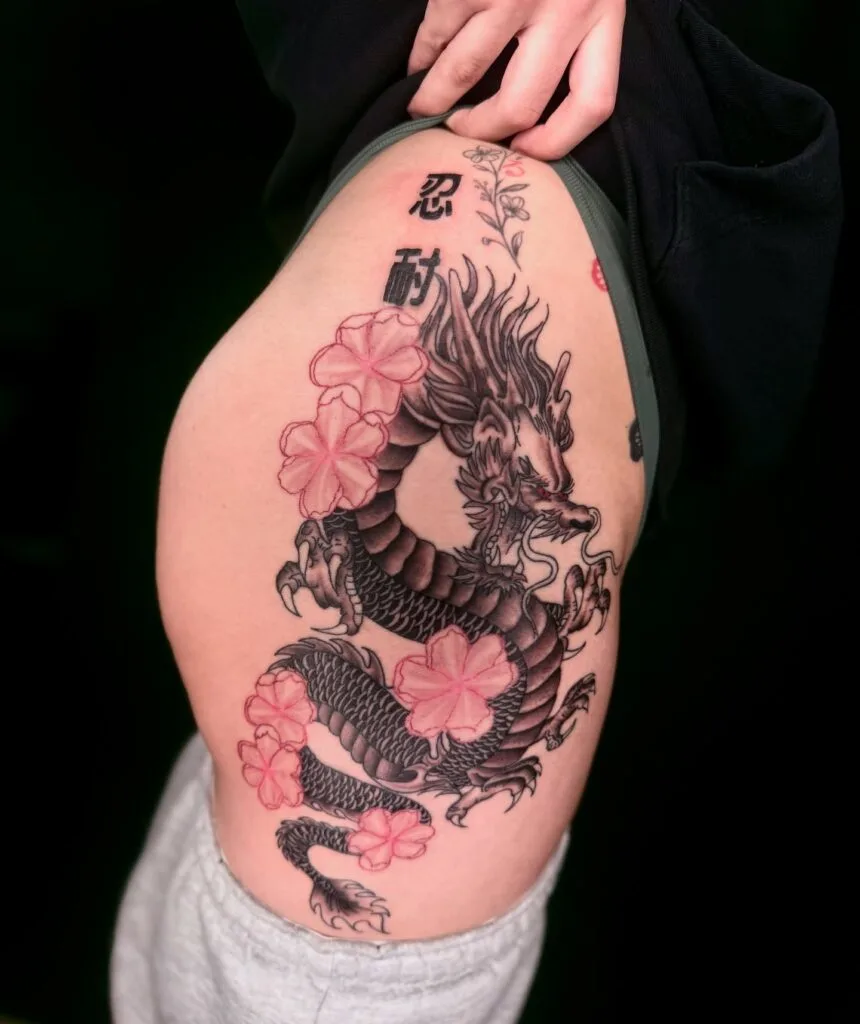 This striking thigh tattoo features a detailed black and gray Asian-style dragon, symbolizing strength, protection, and wisdom. Soft pink cherry blossoms are scattered throughout the design, creating a powerful contrast between the dragon’s fierce presence and the delicate beauty of the flowers.