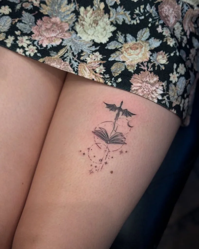 This whimsical thigh tattoo features an open book releasing a stream of stars, constellations, and cosmic symbols, with a small dragon flying upward from its pages.