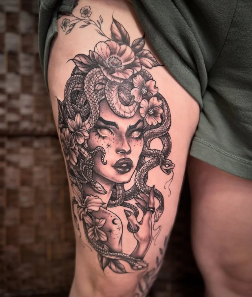 This mesmerizing thigh tattoo portrays a powerful Medusa-like figure with piercing white eyes, snake hair, and floral accents. The fine black and gray shading brings out the intense expression, while the detailed serpents coil elegantly around her head and arm.