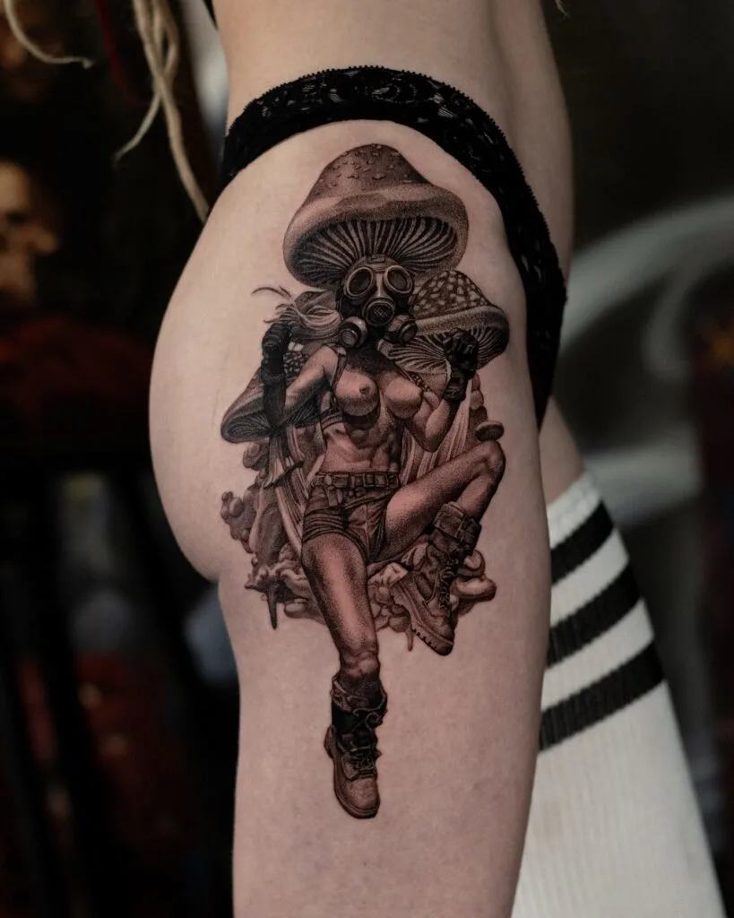 Mushroom Warrior Thigh Tattoo