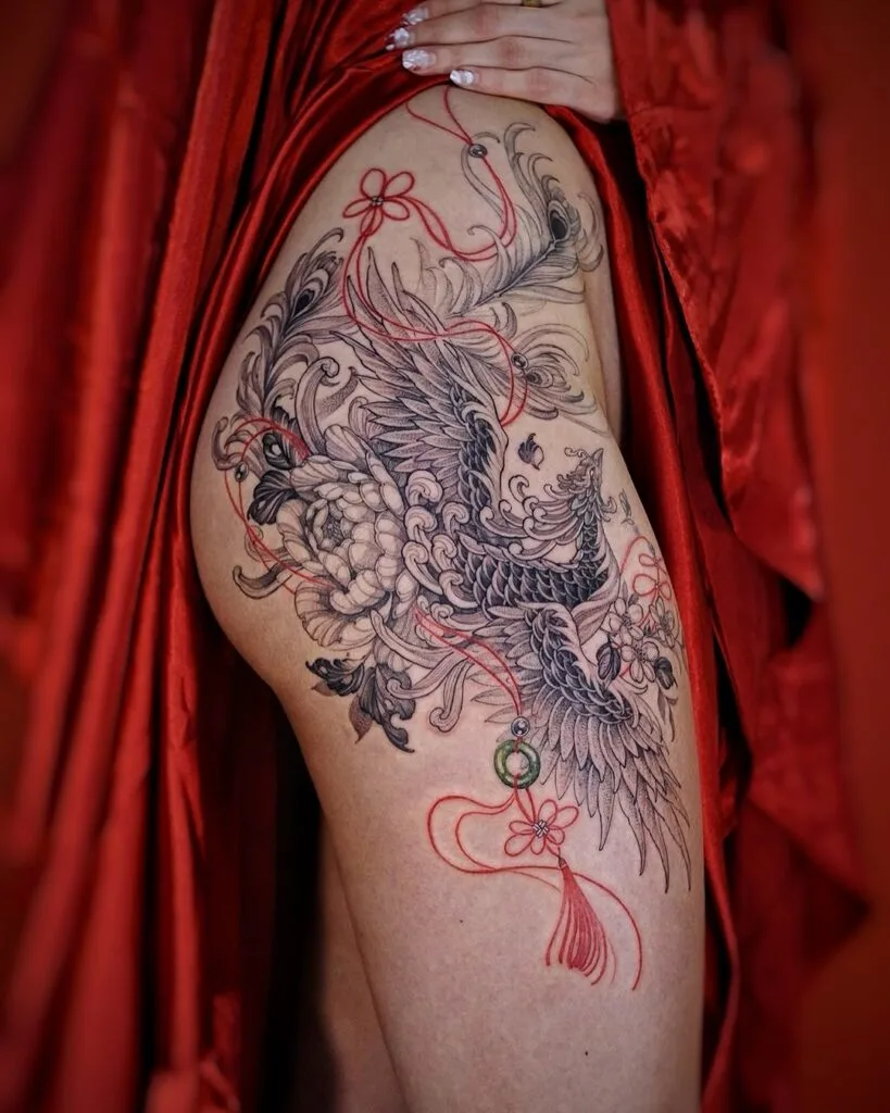 Oriental Phoenix and Red Thread Thigh Tattoo