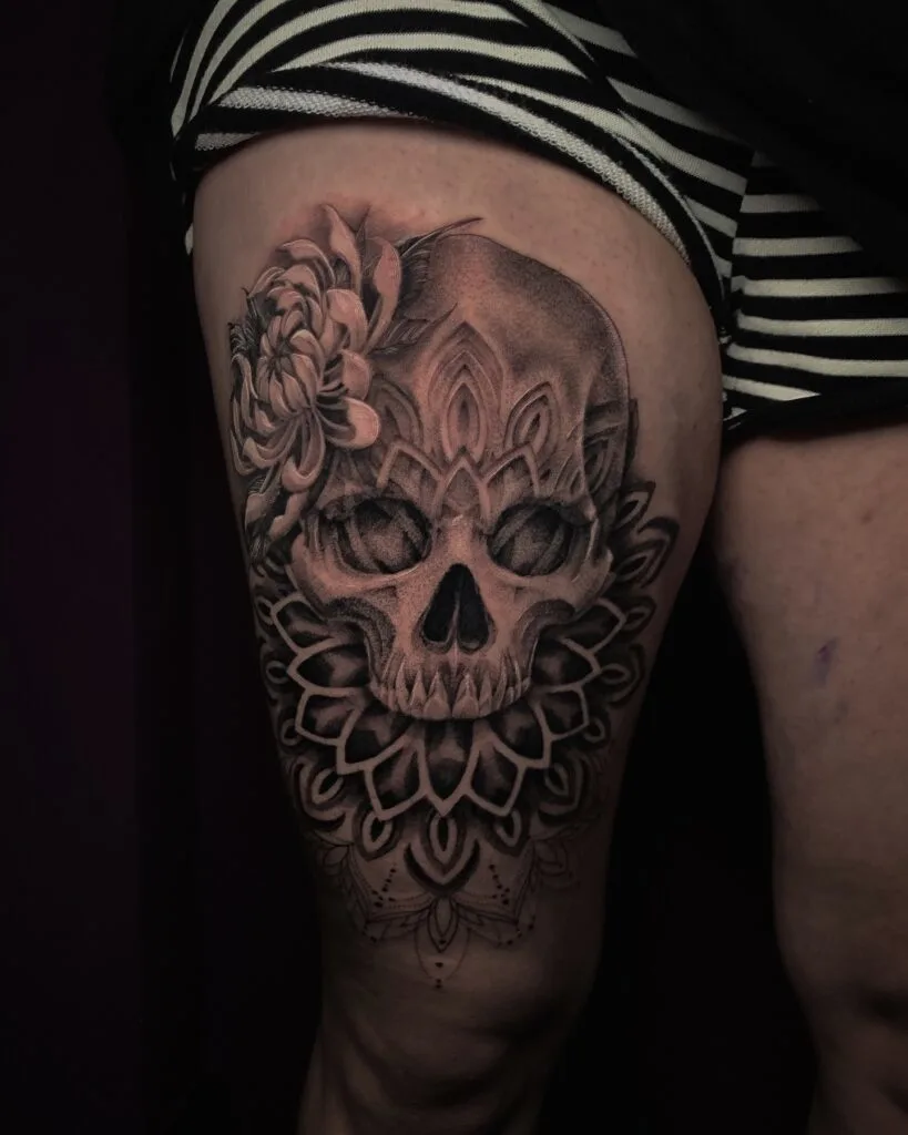 This bold thigh tattoo showcases a hauntingly detailed skull framed by intricate ornamental patterns and mandala-inspired elements. The top of the skull is adorned with a blooming flower, adding a soft contrast to the darker, more intense tone of the design.