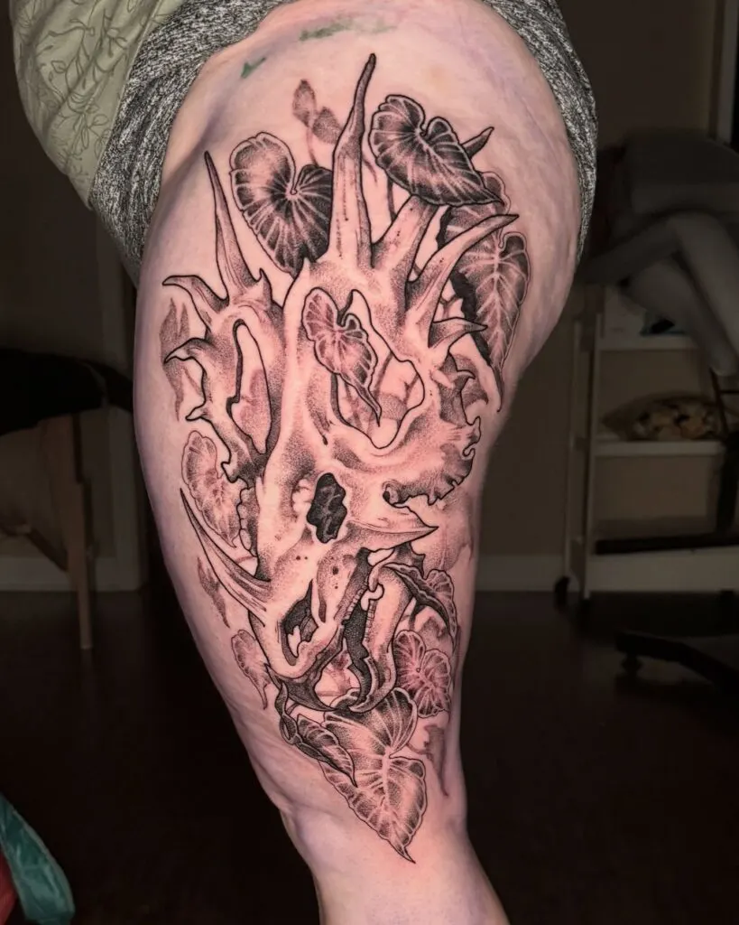 This striking thigh tattoo showcases a detailed Styracosaurus skull intertwined with lush leaves, blending prehistoric power with natural beauty.