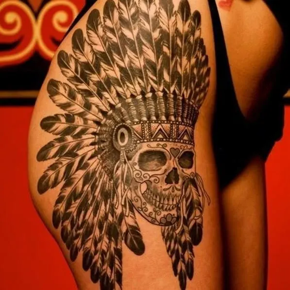 This bold and dramatic thigh tattoo features a stylized skull adorned with an intricate Native-inspired feathered headdress. The skull bears Day of the Dead-style patterns, adding an ornamental touch that balances the intensity of the skeletal imagery.