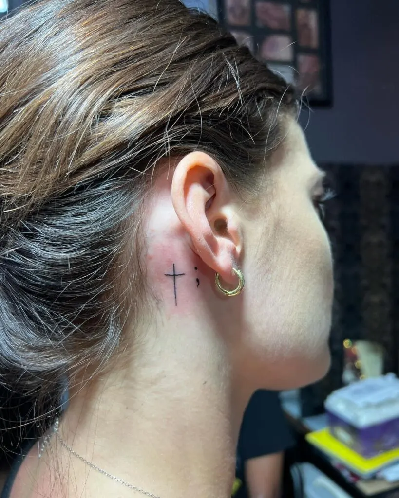This small tattoo behind the ear features a vertical cross paired with a semicolon, creating a meaningful and stylish fusion. The placement is subtle yet bold—easy to conceal with hair or showcase when desired.