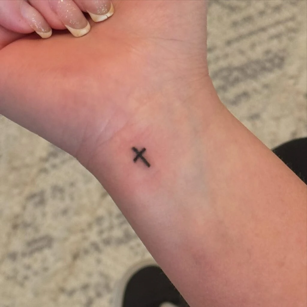 This tiny cross tattoo on the inner wrist stands out with its slightly thicker lines, offering a bold twist on a minimalist design. Despite its small size, it makes a clear and confident statement, perfect for women who want something meaningful that still catches the eye.