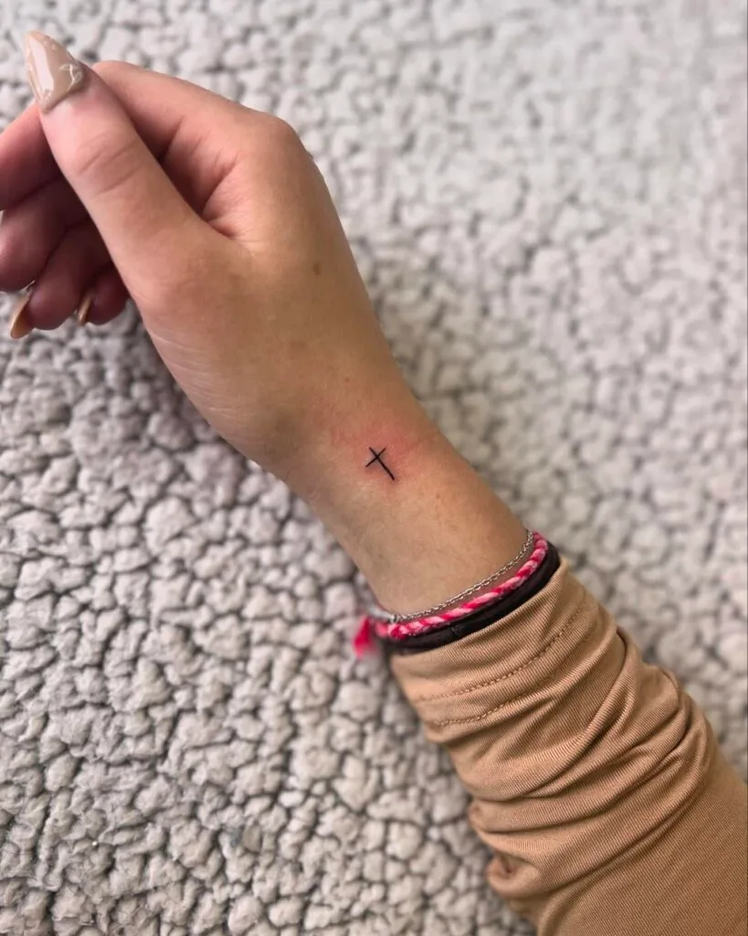 This side wrist tattoo features a tiny, horizontally aligned cross, offering a modern take on a classic symbol. The delicate size and unique orientation give it a creative edge, perfect for women who prefer a minimalist yet personal design.