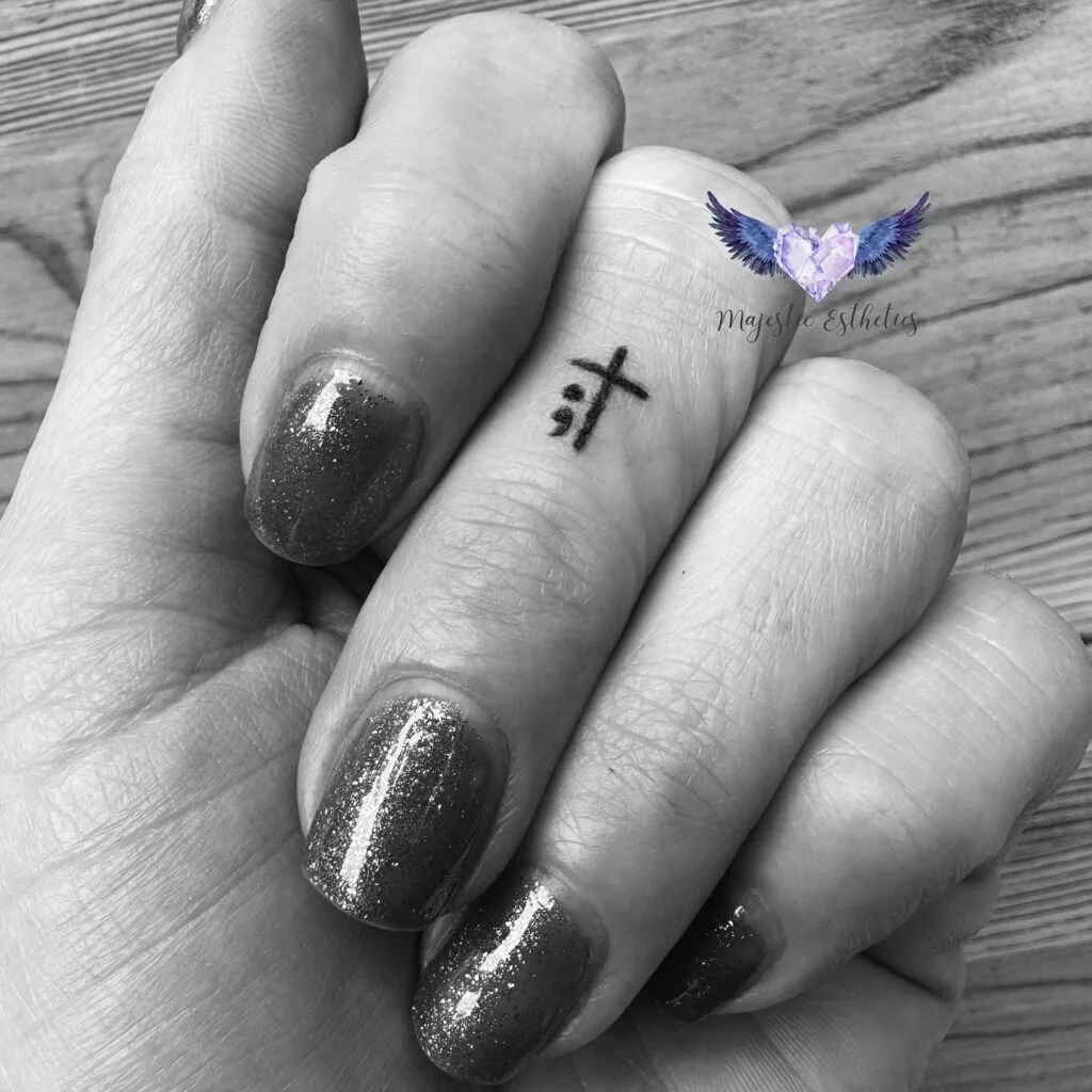 This tiny tattoo combines a bold cross with a semicolon on the side of the finger, blending two powerful symbols into one intimate space. The cross stands for faith and hope, while the semicolon is often linked to mental health awareness and the continuation of one’s story.