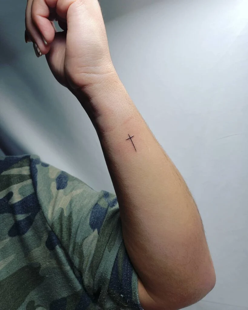 This long, fine-line cross tattoo on the forearm is striking in its simplicity and elegance. The extended vertical line gives it a modern, refined look while keeping the design minimal and balanced.