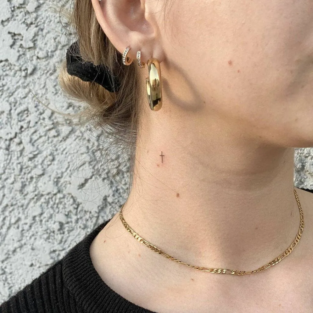 This delicate cross tattoo is placed just below the ear on the side of the neck, making it a subtle yet stylish statement. Its minimalist design keeps the look clean and refined, while the placement allows for a mix of concealment and display depending on your hairstyle.