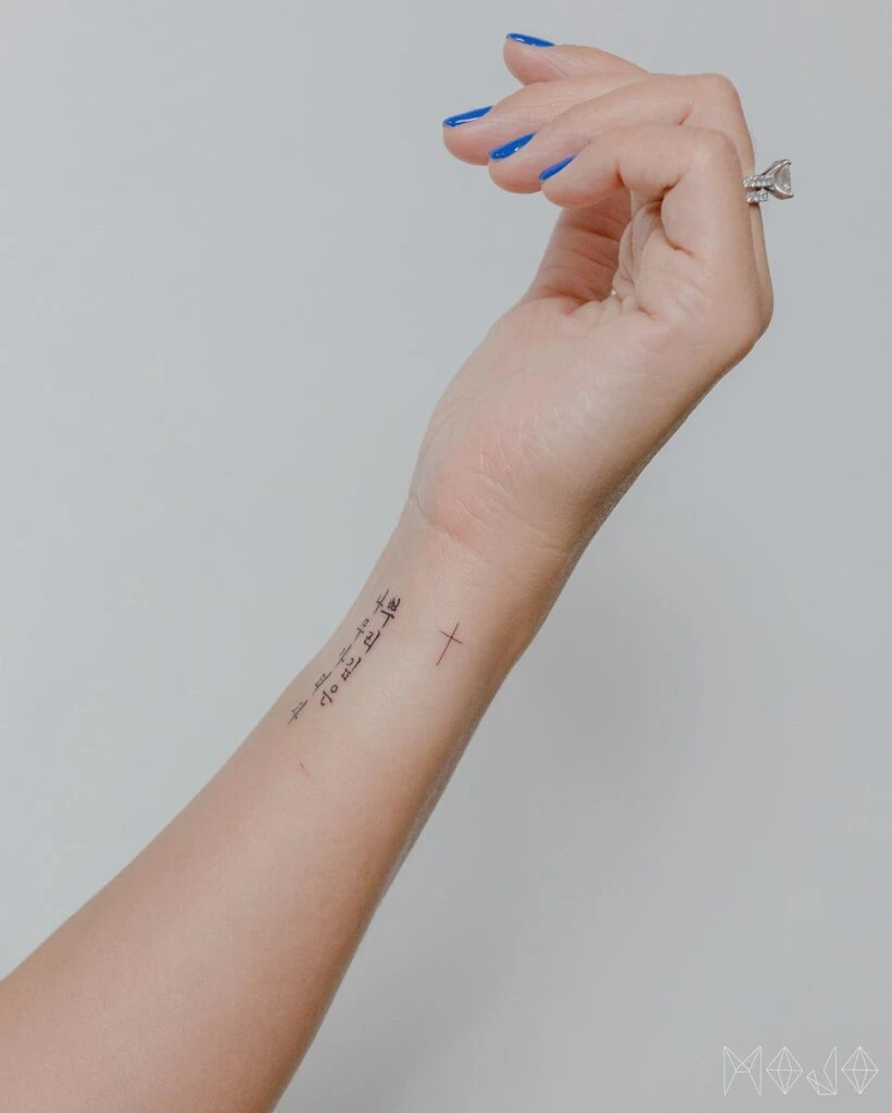 This tattoo features a small cross paired with Korean script along the inner wrist, blending faith and cultural expression in a beautiful and personal design. The minimalist cross symbolizes spirituality, while the Korean text adds a unique, meaningful touch, possibly representing a personal message, a scripture verse, or a phrase with deep significance.