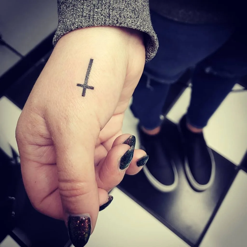This bold tattoo features an inverted cross placed on the hand, offering a striking and edgy design. While traditionally symbolizing a variety of meanings, including rebellion or personal beliefs, the inverted cross can also represent humility and reflection on deeper spiritual themes.