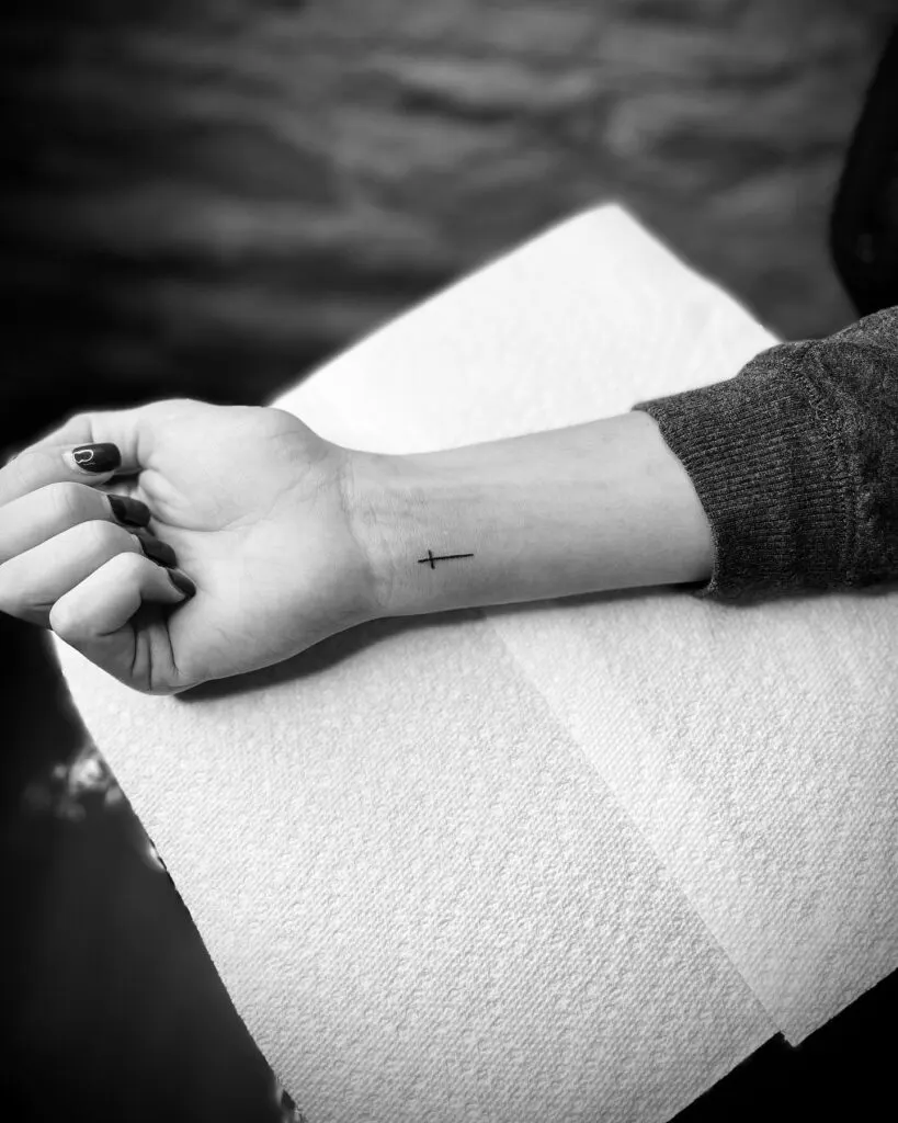 This tattoo showcases a small black cross placed delicately on the inner wrist, offering a simple yet meaningful expression of faith. The minimalist design makes it an elegant choice for women seeking a subtle and timeless symbol of spirituality.