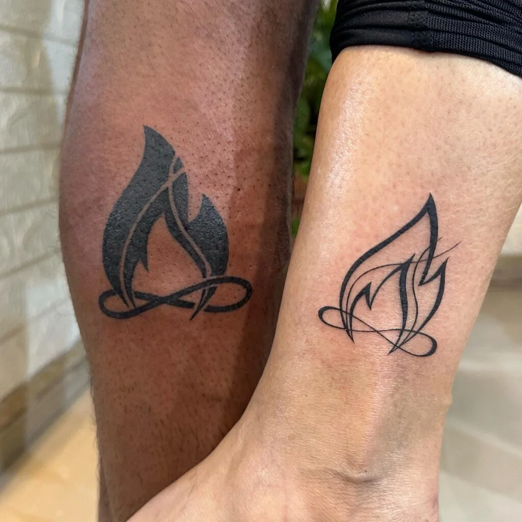 This matching twin flames tattoo features an elegant flame design with the infinity symbol intertwined at the base. The bold, dark lines of the flame represent the eternal passion and connection shared between the two individuals, while the infinity symbol reinforces the idea of everlasting love and unity.