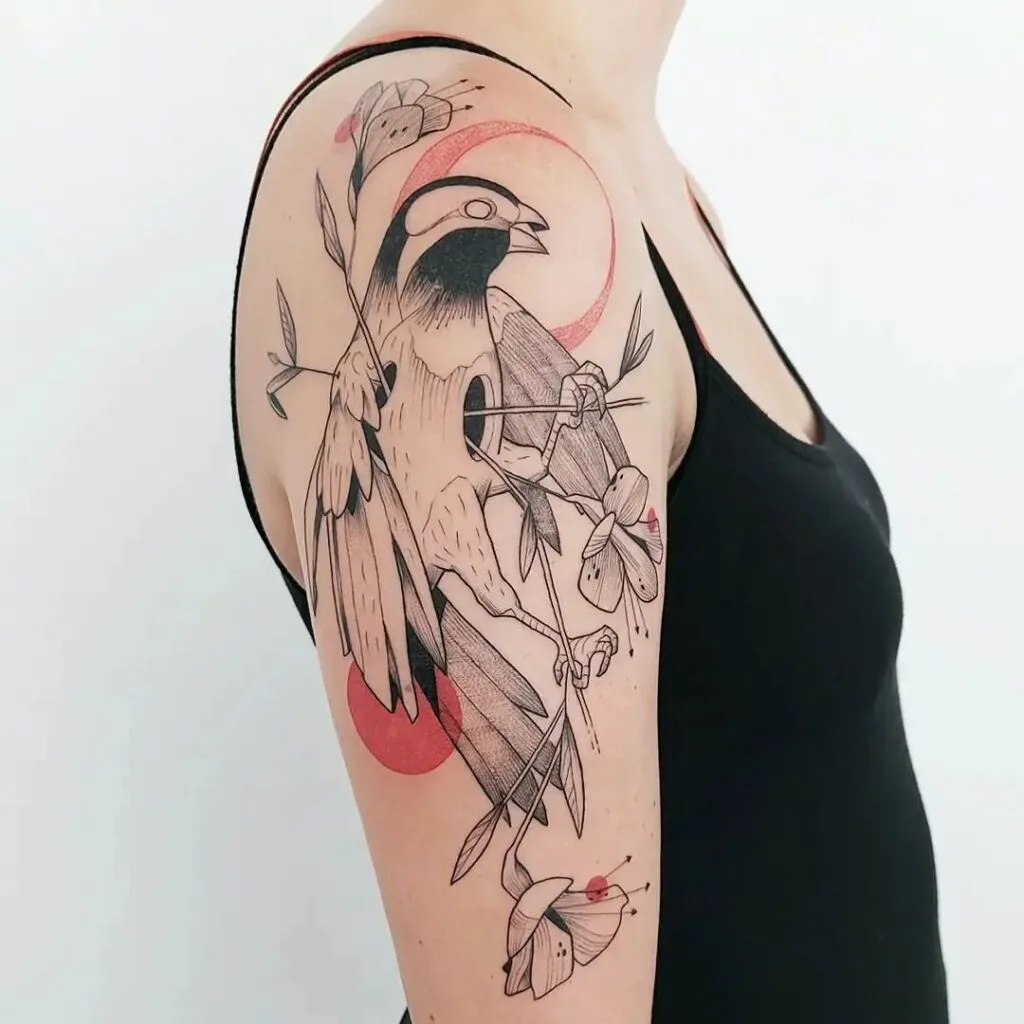 Abstract Bird and Red Sun Upper Arm Tattoo