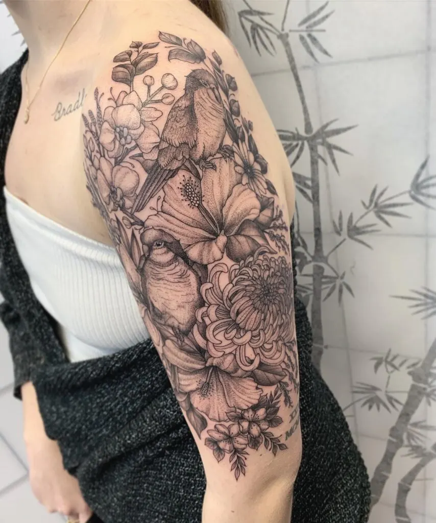 This upper arm tattoo blends a small bird with detailed flowers that wrap naturally around the arm. The design uses soft shading to create depth, giving each petal and leaf a clear place in the composition. The bird sits calmly among the blossoms, adding a gentle focal point that feels grounded and warm.