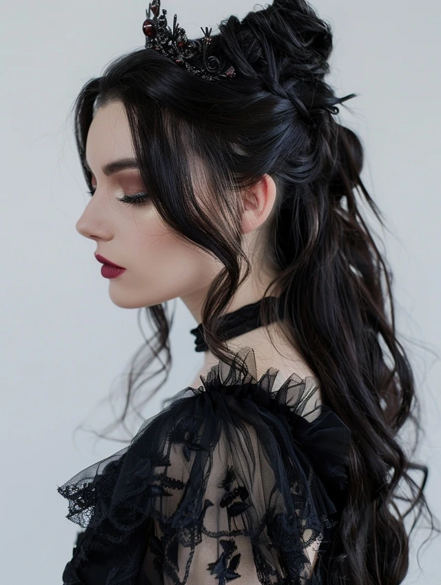 Perfect for casual gothic fashion or formal events. Secure twists with pins or clips and use a shine serum. The half-up style is versatile, giving a mix of elegance and mystique while allowing loose, flowing hair for drama.