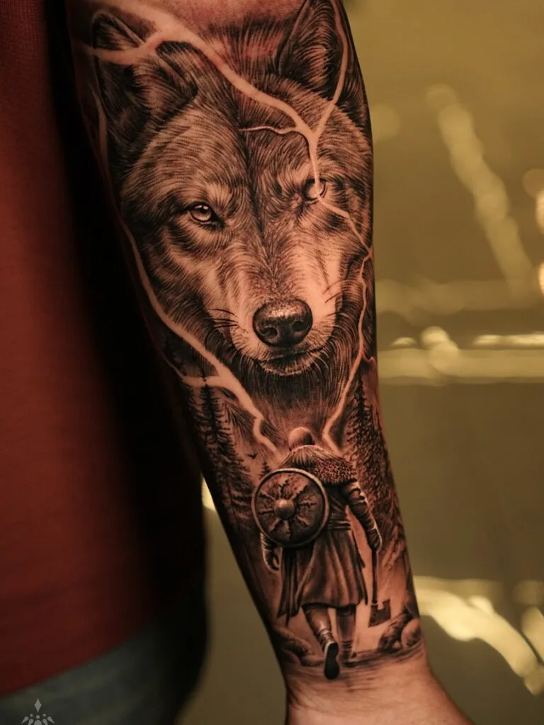 This Viking tattoo blends a powerful wolf portrait with a lone warrior walking through a forest path. The wolf’s intense eyes sit at the top, creating a strong protective presence that guides the design. Lightning-like streaks run across the wolf’s face, adding motion and raw energy.