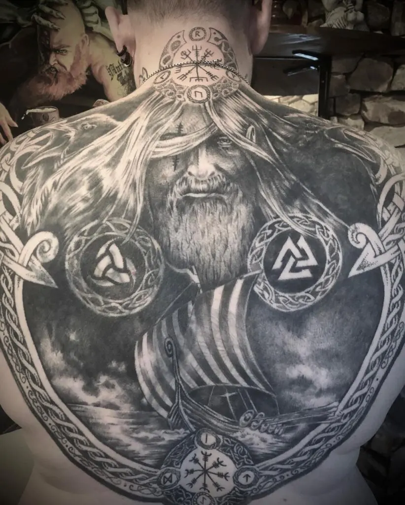 This Viking tattoo covers the entire back with a powerful portrait of Odin surrounded by detailed knotwork and ancient symbols. His face sits at the center, framed by flowing hair, a long beard, and two circular symbols featuring the Valknut and Triquetra.