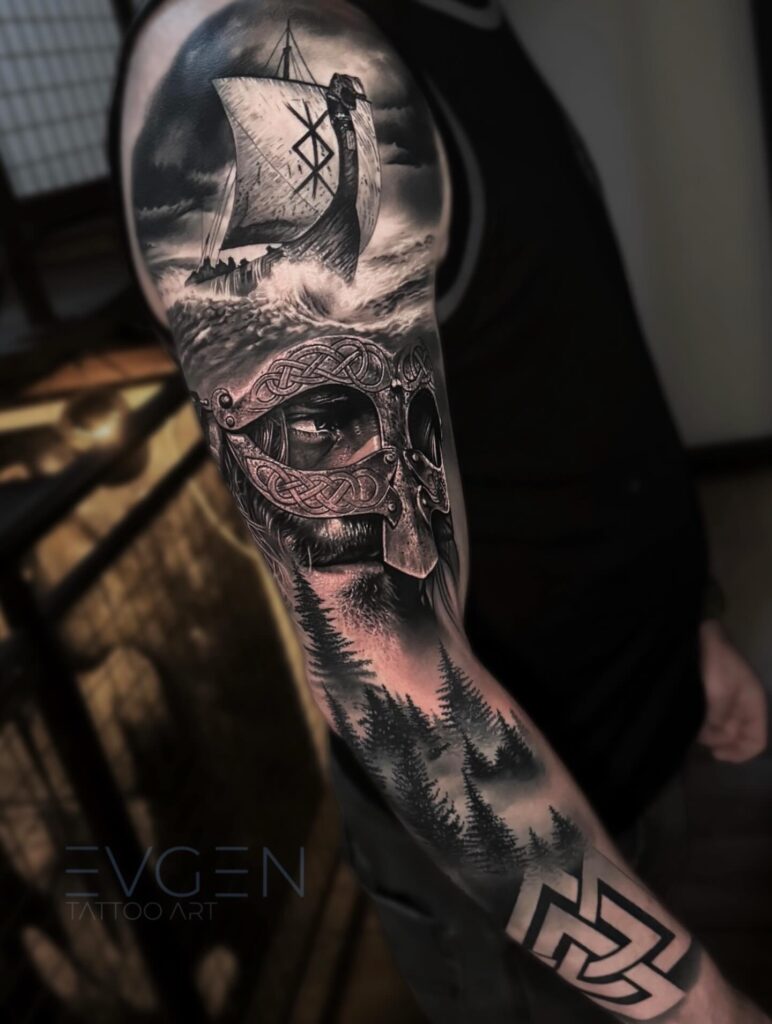 This Viking tattoo builds a powerful story from shoulder to forearm. A longship battles heavy waves at the top, its sail marked with runes that strengthen the design’s meaning. Below it, a warrior’s eyes stare through an ornate helmet detailed with knotwork, giving the piece intensity and focus.