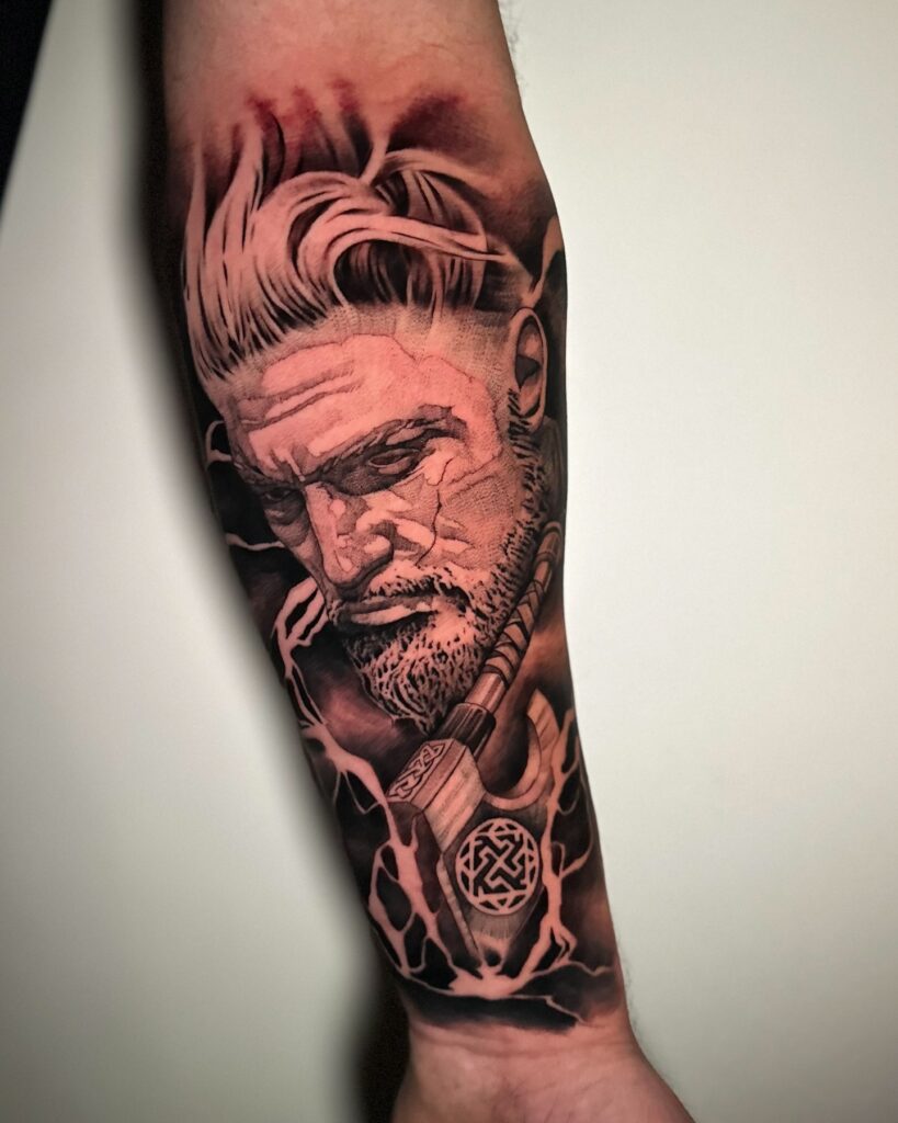 This Viking tattoo shows a detailed warrior portrait paired with a bold depiction of Mjolnir. The shading highlights the warrior’s intense expression, giving him a thoughtful, determined look. Lightning-like streaks wrap around the arm, adding motion and framing both the face and the hammer.