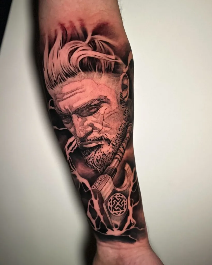 Mjolnir sits near the wrist with carved knotwork, grounding the design in classic Norse symbolism. The artist used strong contrasts to blend the portrait and background smoothly. This tattoo honors courage, resilience, and the spirit of a true Viking fighter.