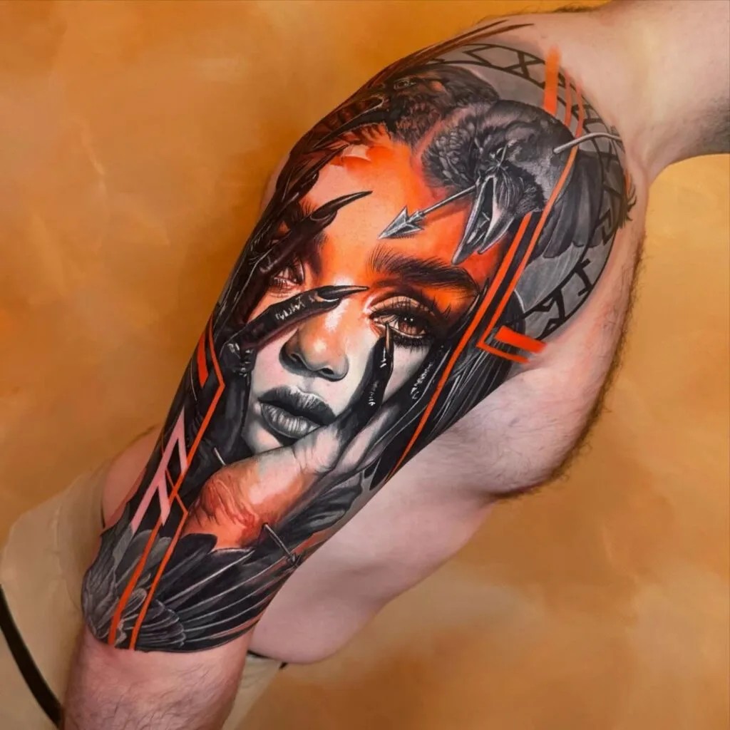 This Viking tattoo blends a striking Valkyrie portrait with bold orange highlights and powerful Norse details. The artist used smooth black-and-gray shading to shape her face, while sharp black claws frame her eyes and add intensity. Bright orange accents cut through the design, creating dramatic contrast that guides the viewer’s attention.
