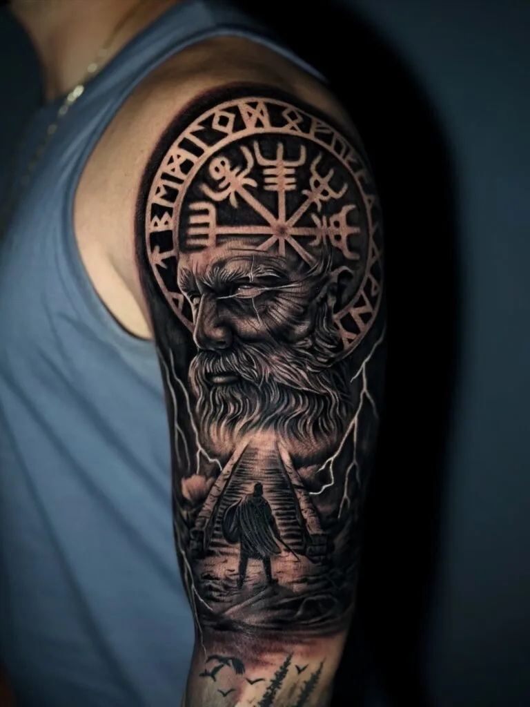 This Viking tattoo shows a powerful portrait of Odin framed by runes and the Vegvisir symbol. His intense expression fills the upper arm, giving the piece a strong guiding presence. Lightning bolts strike around him, adding movement and energy that enhances the dramatic shading.