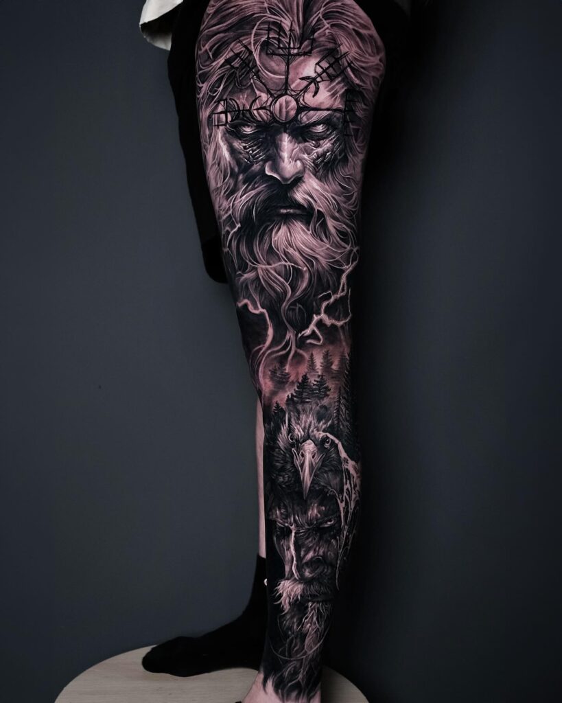 This Viking tattoo shows a powerful full-leg design centered on Odin’s intense face. His long hair and beard flow downward, blending into storm clouds and lightning that add energy to the piece. Runes rest on his forehead, reinforcing his wisdom and connection to ancient magic.