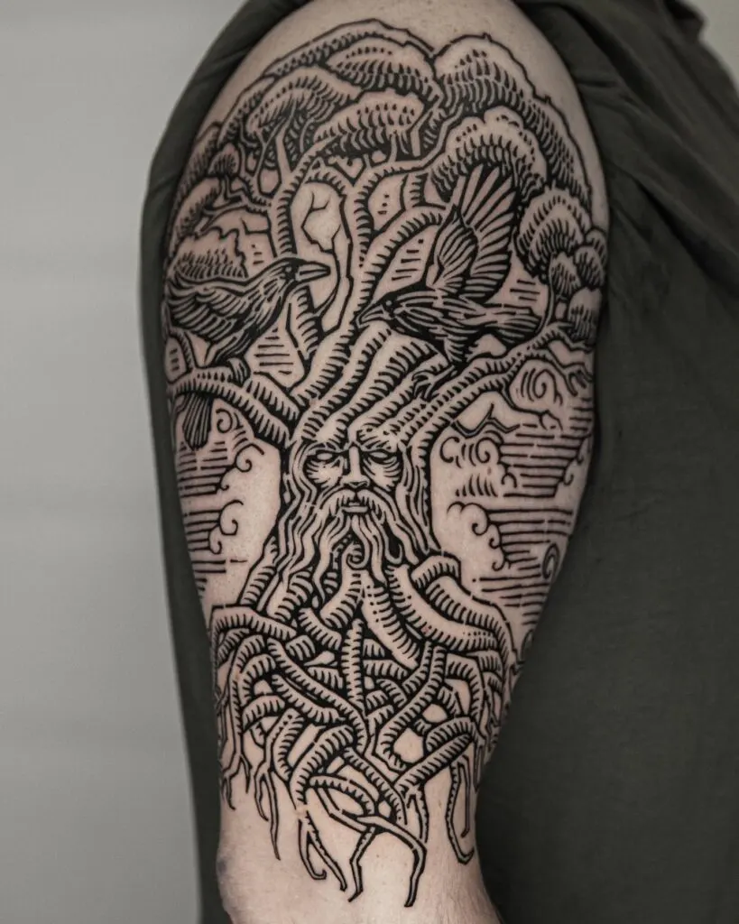 Viking Tattoo with Yggdrasil and Odin’s Ravens
